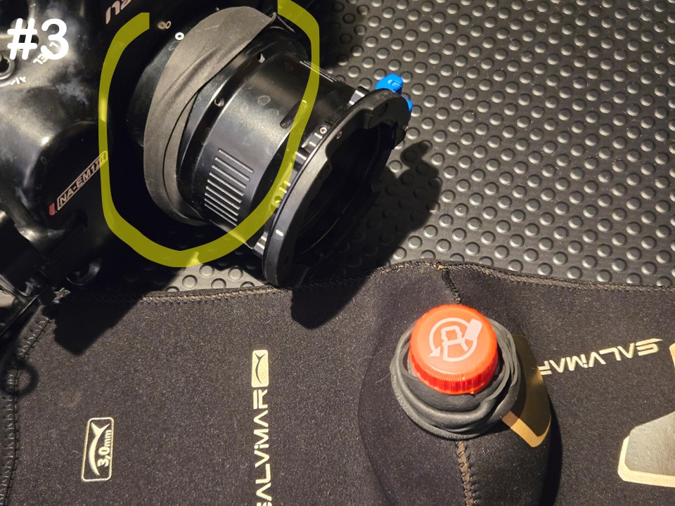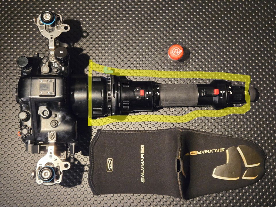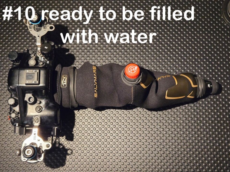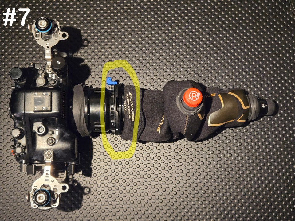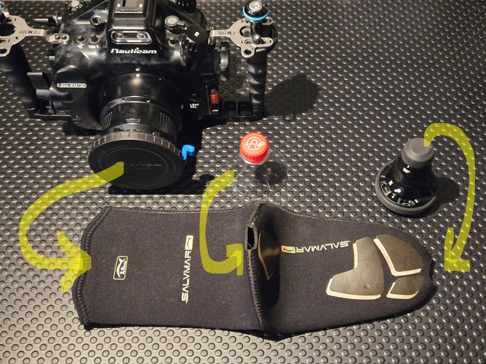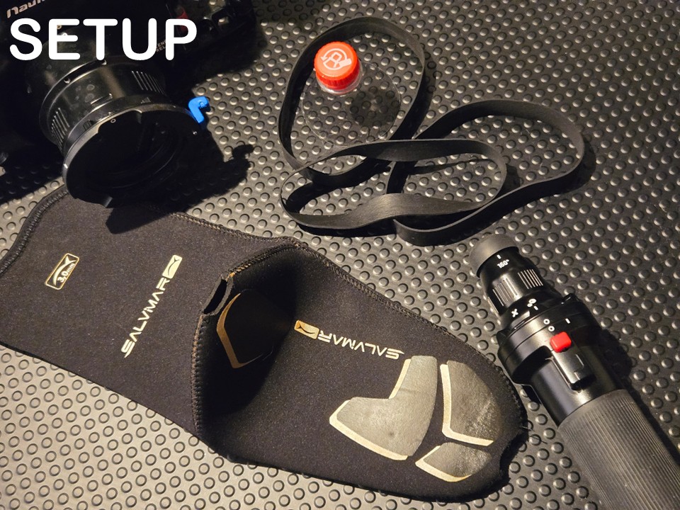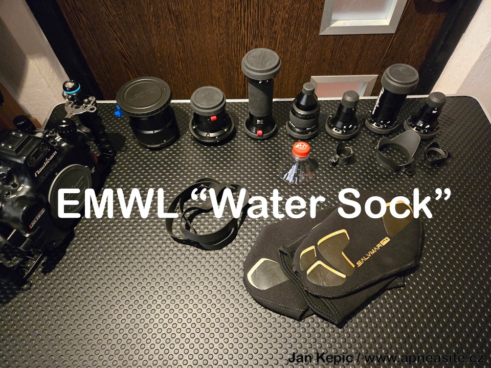 The disadvantage is that it is a fixed setup, i.e., it is not possible to change lenses underwater. I have one sock for 100 + 160 and another sock with a larger opening for 130. I usually bring it to the location ready and only disconnected EMWL from the housing. At the location, I just attach the bayonet, pull the rubber band over the flat port, and fill it with settled drinking water. I can dive with it all day long and the water inside will stay in. Once the setup is submerged, the water doesn’t leak out.