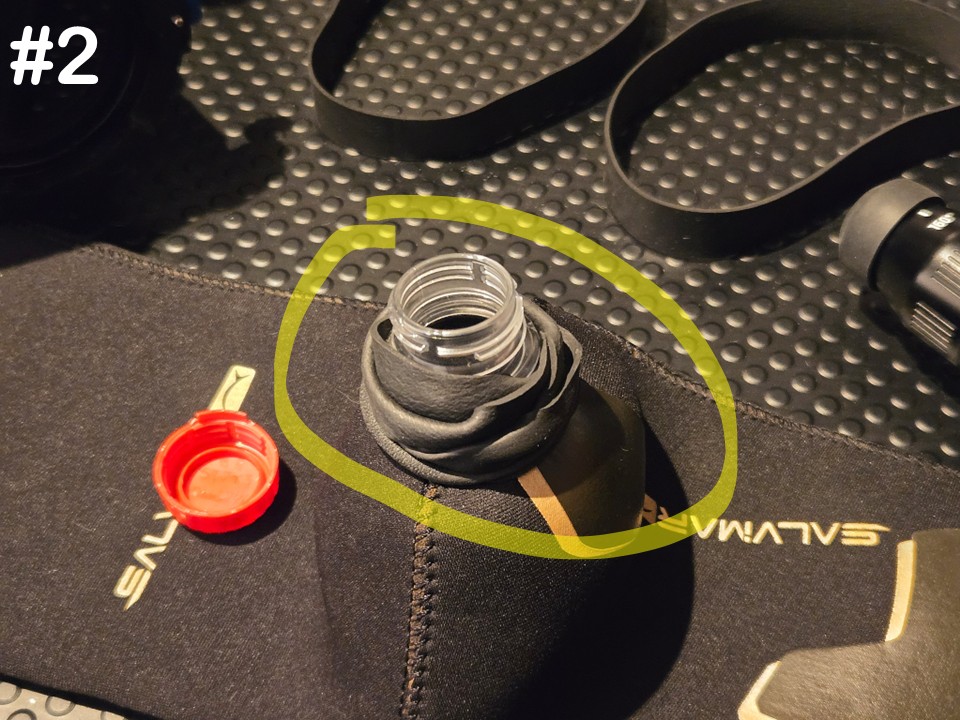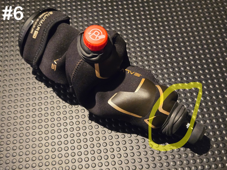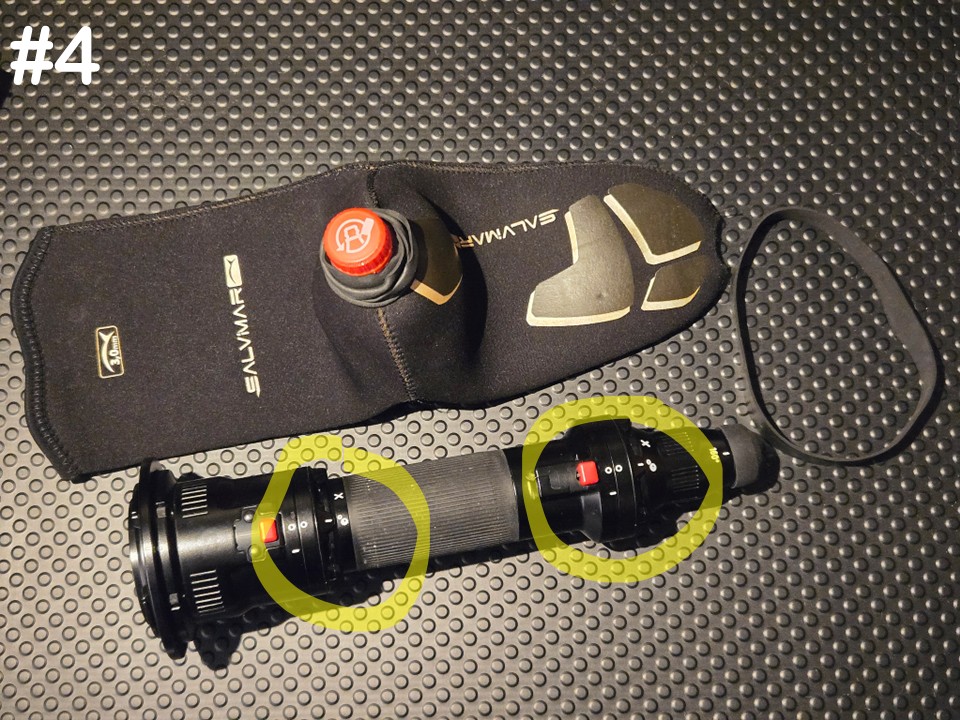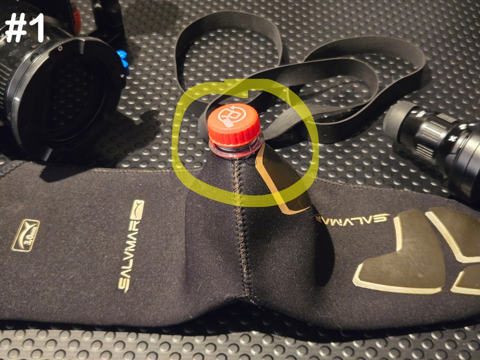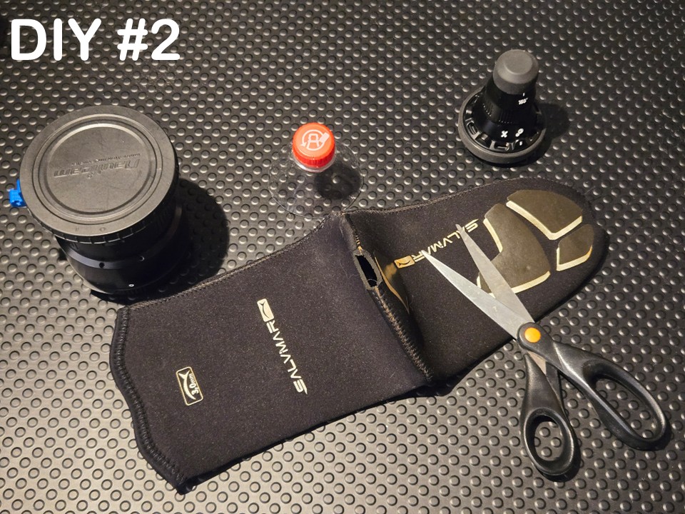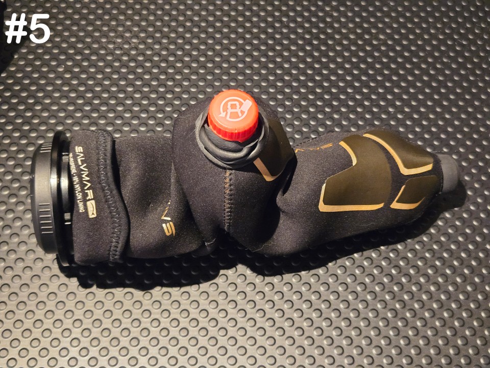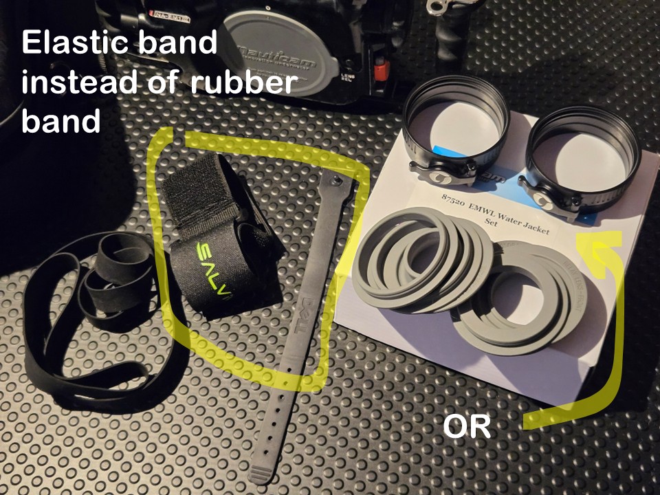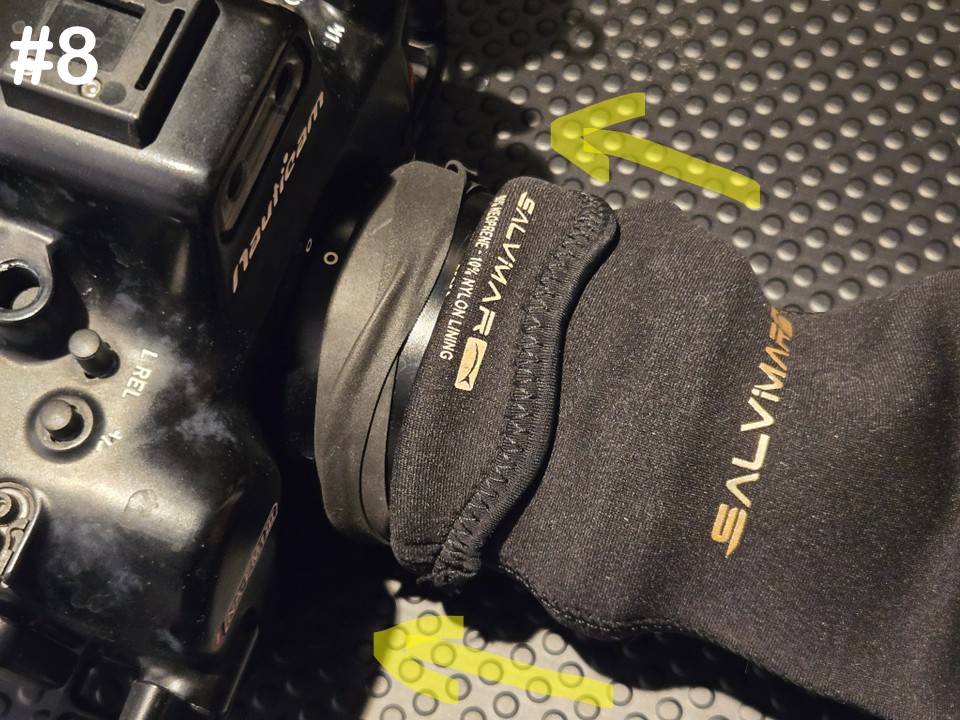 The disadvantage is that it is a fixed setup, i.e., it is not possible to change lenses underwater. I have one sock for 100 + 160 and another sock with a larger opening for 130. I usually bring it to the location ready and only disconnected EMWL from the housing. At the location, I just attach the bayonet, pull the rubber band over the flat port, and fill it with settled drinking water. I can dive with it all day long and the water inside will stay in. Once the setup is submerged, the water doesn’t leak out.