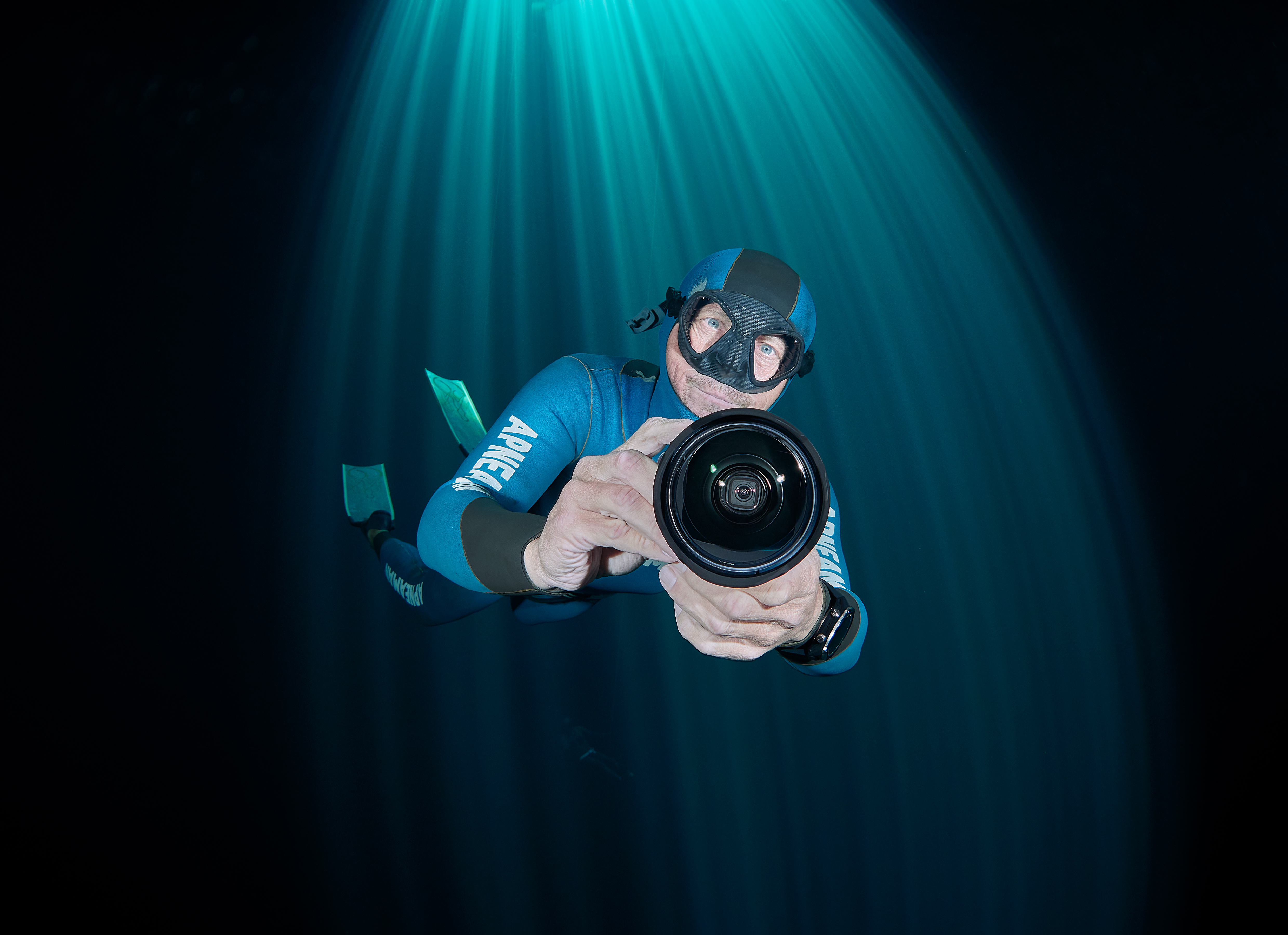 Mexico 2025 – Cenote Maravilla: Under the surface, the water turns into a vast, silent chamber of blue and green. Sunbeams pierce through the opening above, scattering into shimmering columns that fade into the depths. My friend glides with a camera in hand, moving slow and weightless, capturing the quiet of a world where even time seems to hold its breath.