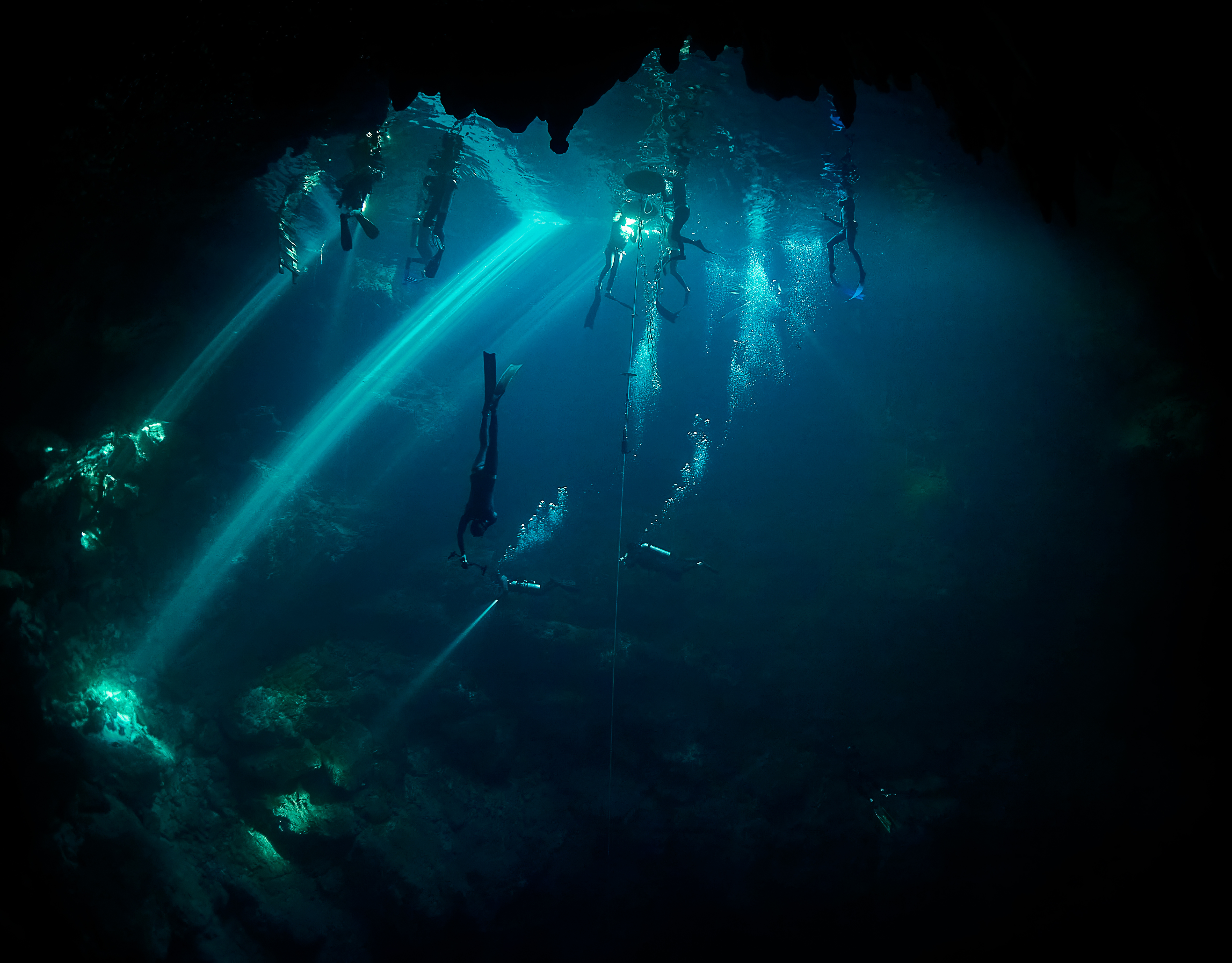 Hidden deep within the jungle of Quintana Roo lies The Pit, a cenote that feels like a secret whispered by the Earth. Its entrance is a narrow shaft, plunging into a cathedral of light and shadow where sunbeams pierce the water like golden spears, illuminating the abyss below. At around 30 meters, a mystical cloud of hydrogen sulfide drifts like a ghostly veil, separating worlds—the living above and the silent realm beneath.